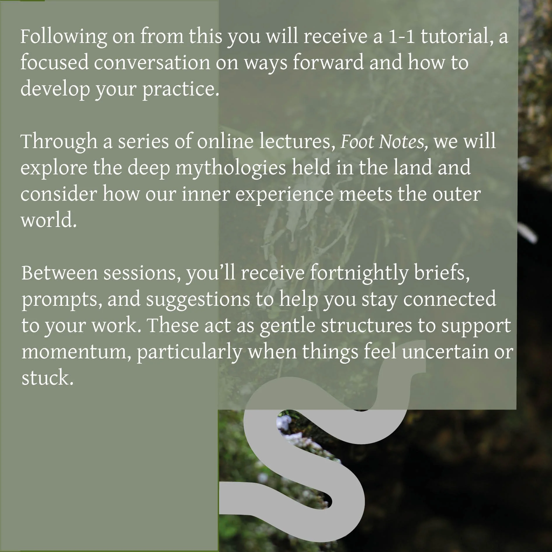 Four Individual Studio Mentoring Sessions You will receive four 1.5-hour online sessions with artist and senior lecturer Lucy Willow. These sessions are designed to integrate the content of the course into a focused discussion on the development of individual practice and how it is feeding into your work, provide critical feedback, conceptual guidance, portfolio development, or simply a space to think aloud about your work.